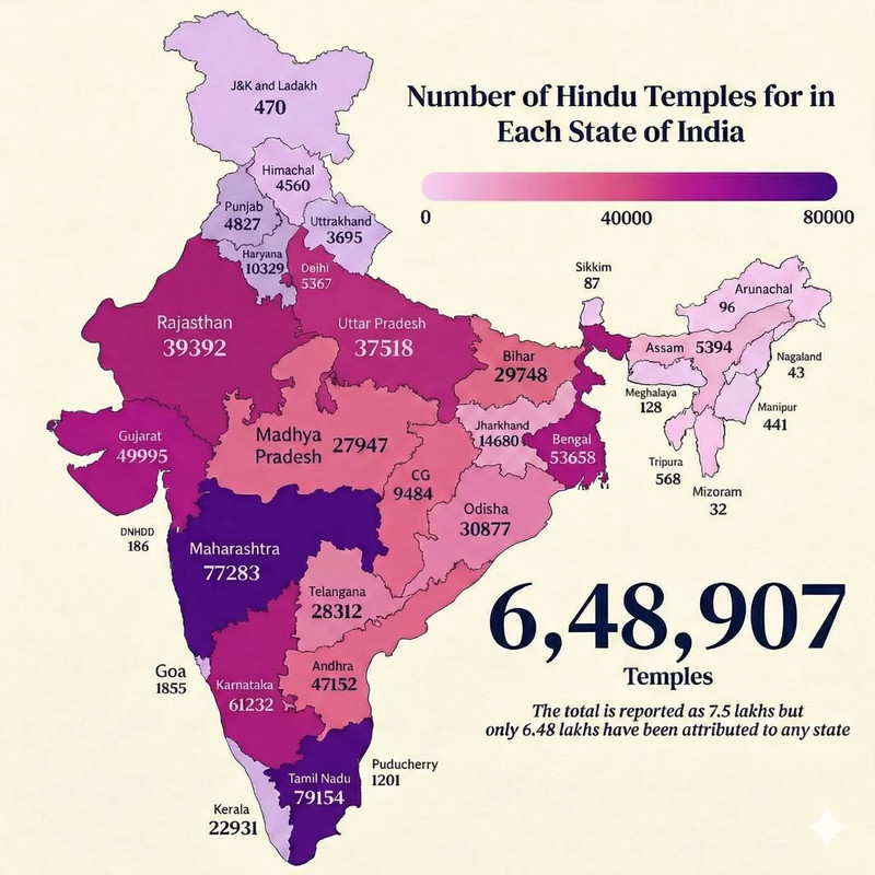 L’Inde compte officiellement 648 907 temples hindous répartis par État (sur un total estimé à environ 7,5 lakhs).